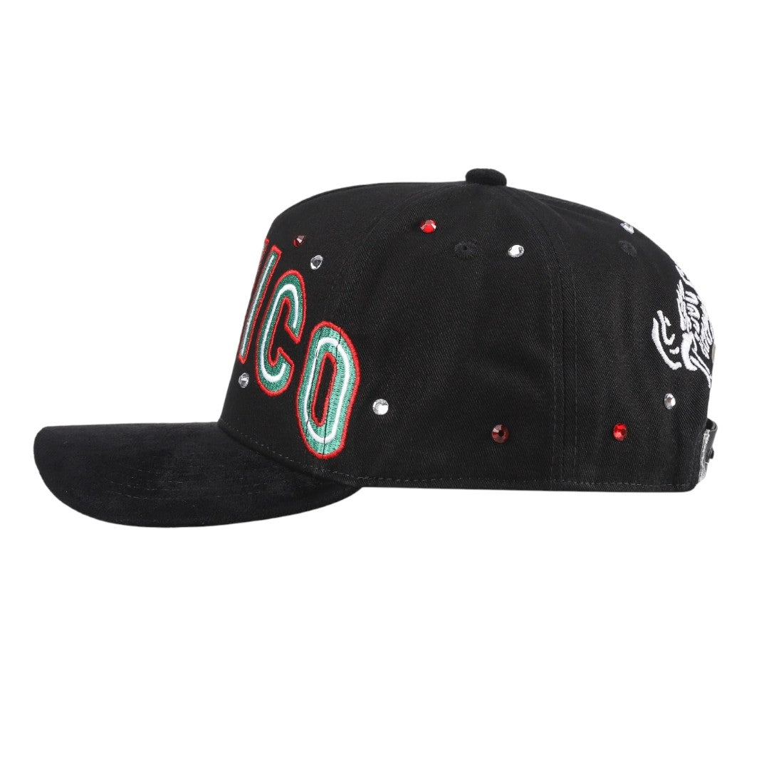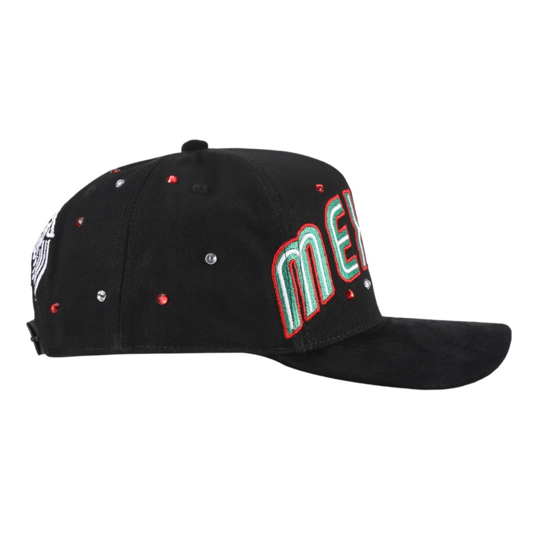 El frente destaca la palabra “MÉXICO” bordada en hilos tricolor (verde, blanco y rojo), acompañada de cristales incrustados en tonos plata y rojo que le dan un brillo distintivo.